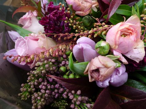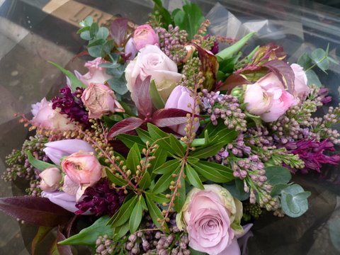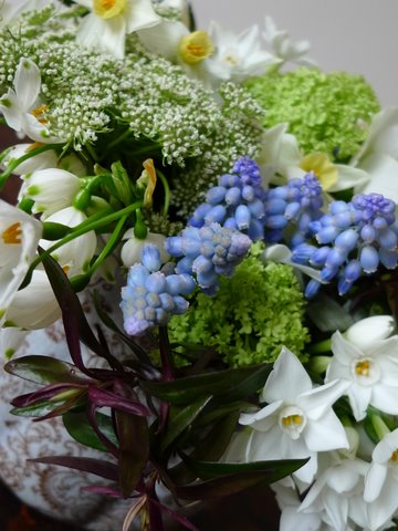 クリスマスローズ、ムスカリ、スノーフレーク、水仙、ラナンキュラス・・・贅沢な春の花々に仕上がります。