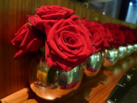 テーブルのお花は赤いバラと決まっています。