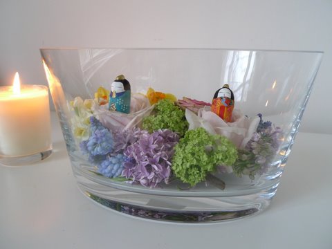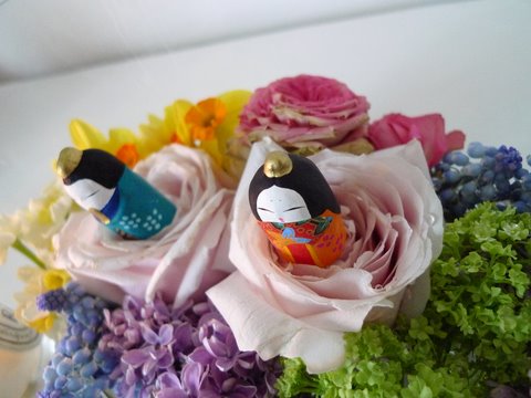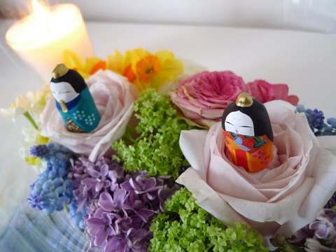 お雛祭りの花、桃と菜の花はないのですが、春の花を使って、香りもいっぱい。大輪のピンクのバラの上に2人を飾ります。